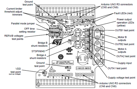 圖5.馬達驅(qū)動擴展板X-NUCLEO-IHM15A開關(guān)和連接器位置圖