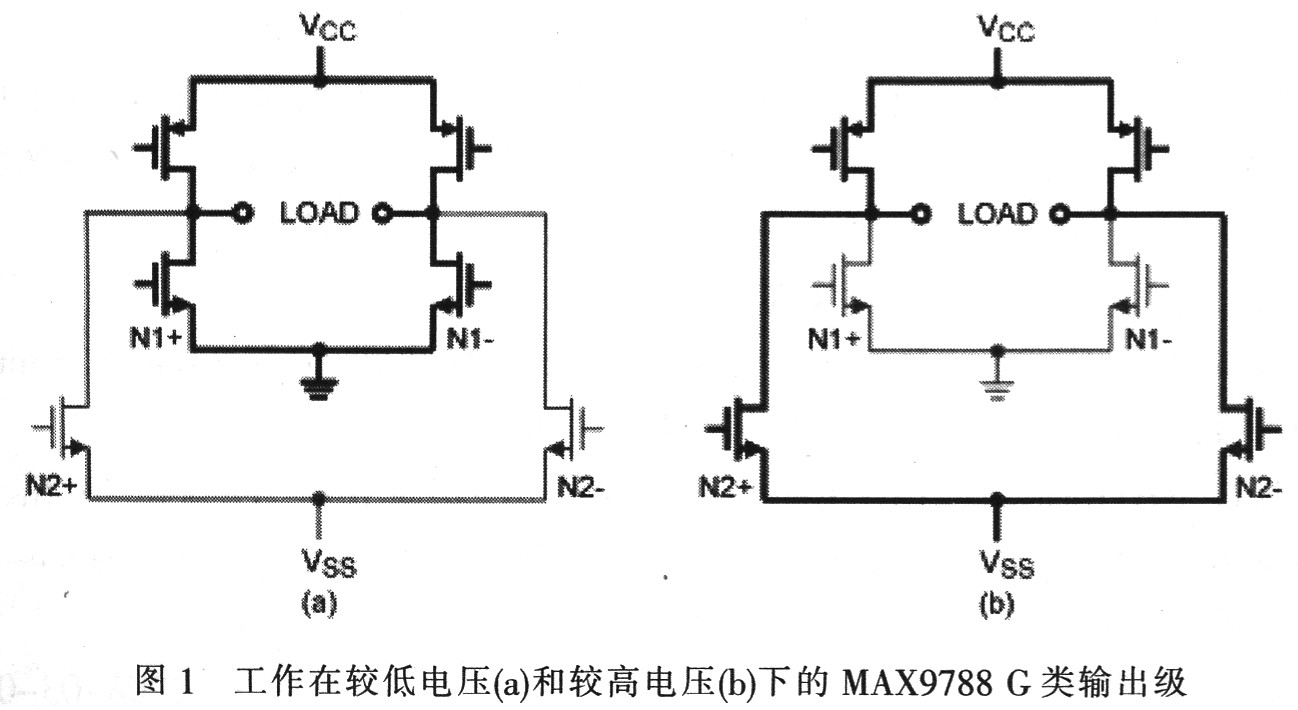 G類放大器MAX9730和MAX9788則以獨特的方式利用G類技術(shù),它們由電荷泵產(chǎn)生負壓,而非高、低正電源。當(dāng)放大器產(chǎn)生較小的輸出信號時,放大器由電池電壓和地作為供電電源。這種模式下,器件的工作方式與常見的5 V AB類放大器(圖1a)類似。當(dāng)輸出信號超出電源電壓時,放大器選擇電池電壓和負電荷泵輸出供電(圖1b)。由此,G類放大器的輸出信號遠遠高于傳統(tǒng)放大器的信號。