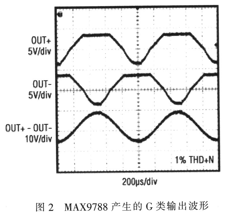 MAX9730和MAX9788可以確保在兩電源之間切換不會產(chǎn)生音頻雜音。當(dāng)輸出信號達到VCC和GND供電所允許的極限時,負電源被自動連接至輸出級。這樣,輸出信號不會在負擺幅側(cè)出現(xiàn)削頂,仍箝位于其正擺幅。為了校正這一點,放大器給負極性輸出增加額外的校正信號,如圖2所示。分別觀察正、負輸出時,正半周波形被明顯削頂,而負半周存在明顯失真。盡管這些信號出現(xiàn)了嚴重的失真,但卻被嚴格控制,充分利用了該架構(gòu)的優(yōu)勢。施加到負載上的實際輸出信號沒有失真。