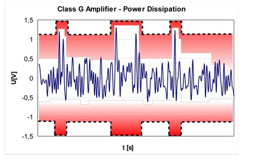 為解決這個(gè)問題,G類和H類放大器采用的放大器電源電壓要在一定程度上滿足所需的輸出功率。G類放大器一般有兩種電源電壓水平。較高的電源電壓水平由所需的最大輸出功率決定。較低的電源電壓水平則由最小電源電壓決定,放大器能夠在這個(gè)電壓下工作,且這個(gè)電壓高于總諧波失真(THD)的閾值。