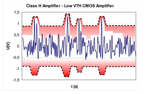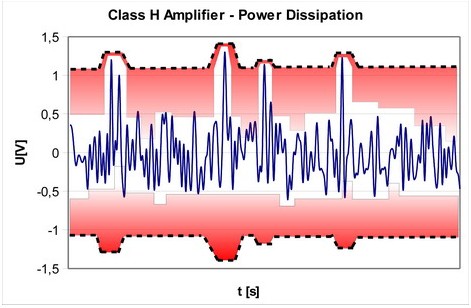 相對(duì)于G類放大器,H類放大器可根據(jù)輸出信號(hào)的要求平穩(wěn)地調(diào)節(jié)輸出電壓。因此,不同于G類放大器,H類放大器不受限于兩或三種固定輸出電壓。它能將來自降壓轉(zhuǎn)換器的最低允許電源電壓平穩(wěn)轉(zhuǎn)換為任意一種離散輸出電壓。