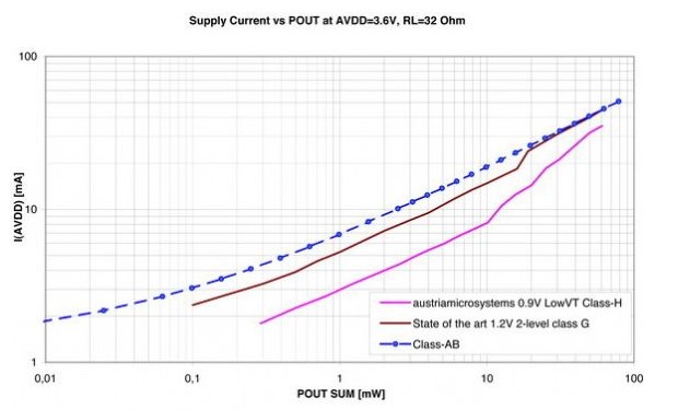 這正是奧地利微電子特殊的LowVT CMOS工藝的承諾。這些工藝已用于生產(chǎn)全新的AS3561器件。AS3561是一個(gè)H類放大器,可為耳機(jī)放大器提供低至±0.9 V的電源電壓。搭配高效率DC-DC轉(zhuǎn)換器及自適應(yīng)式電荷泵,它可將功耗降至最低:2 x 0.1mW播放的電池電壓為3.6V,典型電流消耗僅有1.7mA。這種高效率架構(gòu)與G類及AB類架構(gòu)之間的功耗差異見圖4。