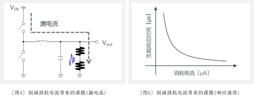 “對元件漏電流的影響增加”是指組成電源IC的部件中MOS(Metal Oxide Semiconductor Field Effect Transistor)晶體管相關(guān)的問題。該晶體管即使在OFF狀態(tài)下也會流過一定的漏電流。該漏電流產(chǎn)生于內(nèi)部電路或輸出段。例如,以流入反饋電阻的漏電流為例(圖4),如果是之前的電阻值,則相對于輸出電壓產(chǎn)生的穩(wěn)態(tài)電流(=輸出電壓÷反饋電阻)漏電流十分小,因此可以忽略;但電阻增大后,穩(wěn)態(tài)電流會變小,將無法再忽略漏電流的影響。