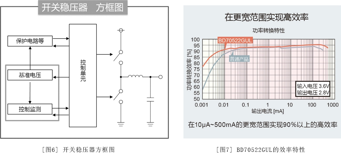 這個1μA的值就是電源IC工作時容許流過的平均消耗電流上限。也就是說,電源IC的消耗電流為nA量級是必要條件。這樣就可以無需增加電池的容量而是通過無限減少電源IC的消耗電流,來延長電子設(shè)備的連續(xù)驅(qū)動時間并進行功能擴展。BD70522GUL將消耗電流削減至180nA,大幅延長了電池續(xù)航時間。