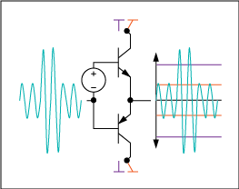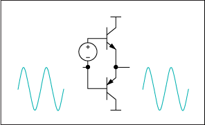 圖3. AB類(lèi)放大器將兩個(gè)晶體管偏置,使其在信號(hào)接近零時(shí)能夠?qū)。所以這類(lèi)放大器的效率比A類(lèi)放大器高,失真比B類(lèi)放大器小。