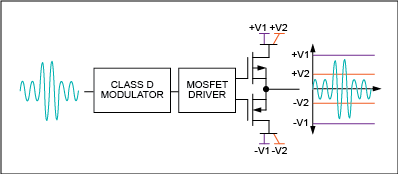 圖6. DG類(lèi)放大器檢測(cè)輸出信號(hào)的幅值,然后根據(jù)需要切換電源軌,以更高的效率提供需要的功率。