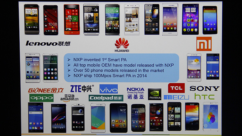 據(jù)Steve透露目前幾乎所有中國一線手機廠商大量旗艦機都采用了恩智浦的智能功放產(chǎn)品,2014年恩智浦功放出貨一億以上,包括小米、HTC、VIVO、聯(lián)想、華為、魅族、中興、金立、酷派等都在使用,有50款機型采用了這個智能功放。