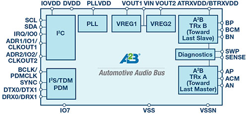 •A2B提供遠高于模擬連接的音頻質(zhì)量,同時還能提供低成本、可擴展的數(shù)字總線架構。