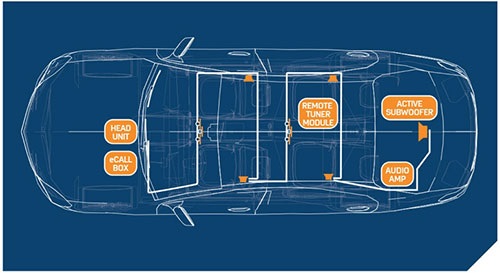 音頻ECU連接是一個成熟的、具有吸引力的應用領域。眾多量產(chǎn)汽車中已部署采用A2B。在音響主機連接至高級音頻功放的簡單例子中(參見圖2),A2B無需使用多條線纜來連接多通道音頻、導航、手機和提示音。A2B可將所有相關線纜替換為低成本的非屏蔽雙絞線,這種通過A2B進行的連接方式已經(jīng)過測試和驗證,符合最嚴格的汽車EMC和EMI兼容性要求。
