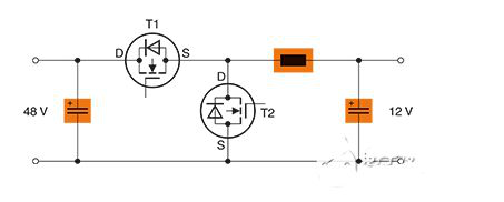 在集成的12/48V系統(tǒng)中,最重要的元件是升降式轉(zhuǎn)換器,該轉(zhuǎn)換器允許能量在兩種不同的電壓等級(jí)之間雙向流動(dòng),并且能提供2~5kW的功率輸出。圖2顯示了這種轉(zhuǎn)換器的電路原理圖。在正常模式下,該轉(zhuǎn)換器作為降壓轉(zhuǎn)換器,將48V系統(tǒng)產(chǎn)生的功率輸出到12V系統(tǒng)中。在此工作模式下,T2一直處于阻斷狀態(tài),而T1則作為開關(guān)工作。如果需要輸出48V等級(jí)電壓,則必須采用升壓模式。在這種情況下,T1一直處于接通狀態(tài),而T2則工作在脈沖模式下。為最大限度降低紋波電流和電壓,實(shí)際運(yùn)用中需要將6個(gè)或8個(gè)模塊進(jìn)行并聯(lián)。