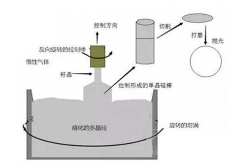 為了形成單晶硅,還需要控制晶體的方向,坩堝帶著多晶硅熔化物在旋轉(zhuǎn),把一顆籽晶浸入其中,并且由拉制棒帶著籽晶作反方向旋轉(zhuǎn),同時(shí)慢慢地、垂直地由硅熔化物中向上拉出。