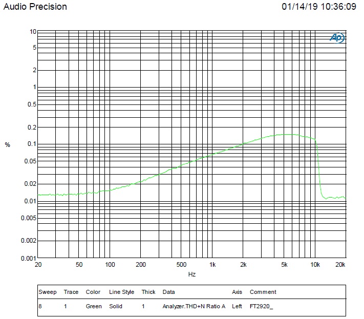 低頻FT2920比HT862T失真度小;中頻兩者接近;高頻HT862T比FT2920好。全頻段HT862T失真在0.04%以內(nèi),F(xiàn)T2920失真度超過0.1%;