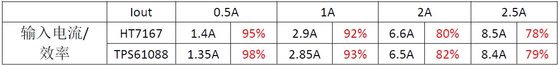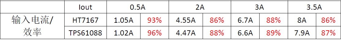 1. 效率對(duì)比:HT7167 跟 TPS61088 效率差別不大,低一到兩個(gè)點(diǎn)。