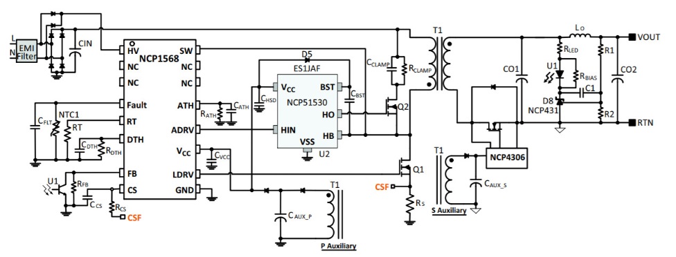 安森美半導(dǎo)體將NCP1568和NCP51530搭配,通過結(jié)合一個高能效的拓?fù)?ACF)和減小器件大小的高頻工作,滿足當(dāng)前市場的需求。雖然這些優(yōu)勢是通過可靠的和已證實(shí)的硅基超級結(jié)FET實(shí)現(xiàn)的,但只要成熟,該方案也兼容GaN器件。
