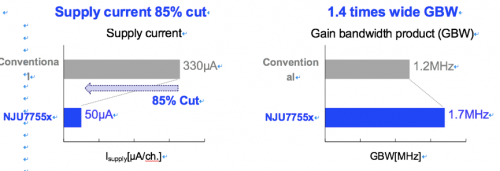 1. 擁有1.7MHz寬帶的同時(shí),實(shí)現(xiàn)了1回路消耗電流僅有50μA的超低功耗