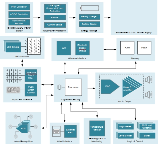 但相比于與互聯(lián)網(wǎng)接口結(jié)合使用的麥克風(fēng)和揚聲器, 這些外形看似簡單的設(shè)備往往更復(fù)雜。智能音箱包含許多電子功能,這些功能均通過采用數(shù)十種復(fù)雜的集成電路(IC) 來實現(xiàn)。原始設(shè)備制造商 (OEM) 憑借差異化產(chǎn)品進(jìn)入智能揚聲器市場,他們必須決定要提供哪些設(shè)備、如何進(jìn)行提供以及此類小型低功耗設(shè)備中可采用的折衷方案。