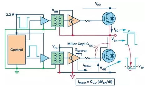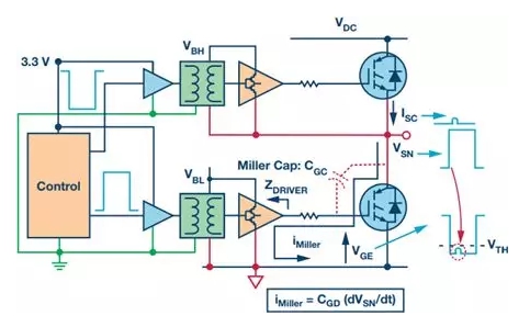 除了系統(tǒng)故障導致的短路,瞬時逆變器直通同樣會發(fā)生在正常工作條件下。此時,IGBT導通要求IGBT驅動至飽和區(qū)域,在該區(qū)域中導通損耗最低。這通常意味著導通狀態(tài)時的柵極-發(fā)射極電壓大于12 V。IGBT關斷要求IGBT驅動至工作截止區(qū)域,以便在高端IGBT導通時成功阻隔兩端的反向高電壓。原則上講,可以通過使IGBT柵極-發(fā)射極電壓下降至0 V實現(xiàn)該目標。但是,必須考慮逆變器臂上低端晶體管導通時的副作用。導通時開關節(jié)點電壓的快速變化導致容性感應電流流過低端IGBT寄生密勒柵極-集電極電容(圖3中的CGC)。該電流流過低端柵極驅動器(圖3中的ZDRIVER)關斷阻抗,在低端IGBT柵極發(fā)射極端創(chuàng)造出一個瞬變電壓增加,如圖所示。如果該電壓上升至IGBT閾值電壓VTH以上,則會導致低端IGBT的短暫導通,從而形成瞬態(tài)逆變器臂直通——因為兩個IGBT都短暫導通。這一般不會破壞IGBT,但卻能增加功耗,影響可靠性。