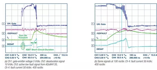 對于直流總線電流檢測電路,必須加一個小型濾波器,避免誤觸發(fā),因為直流總線電流由于潛在的高噪聲電流而斷續(xù)。采用具有3 μs時間常數(shù)的RC濾波器。檢測到過流后,其余有關IGBT關斷的延遲是通過運算放大器、比較器、信號隔離器、ADSP-CM408F中的跳變響應時間,以及柵極驅動器傳播延遲。這會額外增加0.4 μs,使得故障至關斷的總時間延遲為3.4 μs——遠低于很多IGBT的短路時間常數(shù)。
