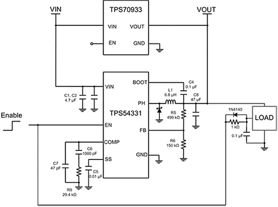圖3:TPS709與TPS54331并聯(lián)(由德州儀器公司提供)。