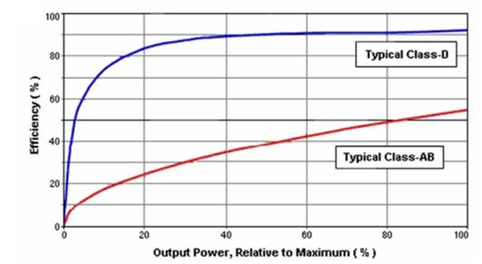一級(jí)ECU供應(yīng)商一直在信息娛樂系統(tǒng)音響主機(jī)單元內(nèi)使用AB類音頻放大器。但AB類放大器的效率明顯低于新型D類放大器設(shè)計(jì)(見圖2)。這很重要,因?yàn)槠嚨囊纛l放大器是音響主機(jī)單元內(nèi)的第二大發(fā)熱源,緊隨SoC之后。音響主機(jī)單元箱內(nèi)產(chǎn)生的更多熱量意味著設(shè)計(jì)人員需要包含更大的無源輻射散熱器或機(jī)械風(fēng)扇。這兩種選擇都加劇了減少整體解決方案尺寸的目標(biāo)。
