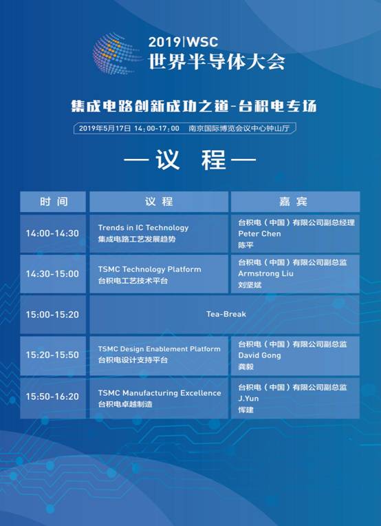 除了發(fā)布新工藝引起業(yè)界轟動(dòng)之外,臺(tái)積電最近又有大動(dòng)作啦!于2019年5月17日-19日在南京國(guó)際博覽中心舉辦的世界半導(dǎo)體大會(huì)上,臺(tái)積電會(huì)舉辦集成電路創(chuàng)新成功之道-臺(tái)積電專場(chǎng)的開(kāi)放式論壇。在臺(tái)積電專場(chǎng)活動(dòng)上,臺(tái)積電(中國(guó))有限公司副總經(jīng)理陳平、臺(tái)積電(中國(guó))有限公司副總監(jiān)劉堅(jiān)斌、臺(tái)積電(中國(guó))有限公司副總監(jiān)龔毅、臺(tái)積電(中國(guó))有限公司副總監(jiān)惲建等臺(tái)積電企業(yè)高管均會(huì)蒞臨論壇現(xiàn)場(chǎng)分享在他們眼中的集成電路創(chuàng)新成功之道。