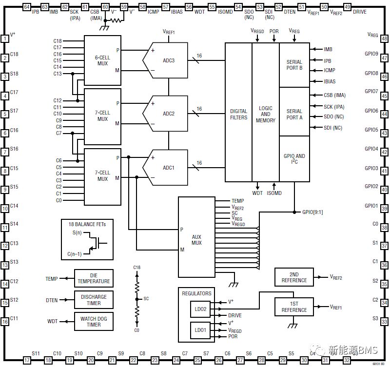 上圖是ADI的LTC6813的內(nèi)部功能框圖,目前市面上可以接觸到的AFE內(nèi)部結(jié)構(gòu)大同小異,不同點(diǎn)更多是集中在硬件資源方面;還有的話就是針對(duì)功能安全要求所設(shè)計(jì)的架構(gòu)形式。簡(jiǎn)單來(lái)講,最主要的不同點(diǎn)是采樣通道數(shù)量、內(nèi)部ADC的數(shù)量、類型與架構(gòu)(關(guān)于ADC這一塊,后面可以單獨(dú)拿出來(lái)討論)。