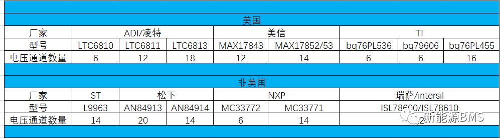 目前可供我們選擇的車規(guī)AFE資源是有一些的(如下表),可能有些信息不太準(zhǔn)確,有些還處于樣片階段,僅供參考。里面把美國(guó)和非美國(guó)的器件分了類,其實(shí)NXP和瑞薩與美國(guó)的關(guān)系也比較密切,有些說(shuō)不清。國(guó)內(nèi)的AFE起步有點(diǎn)晚,可以看到實(shí)際上車的幾乎沒(méi)有。