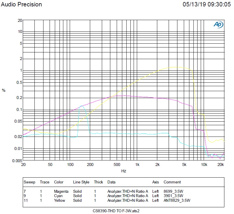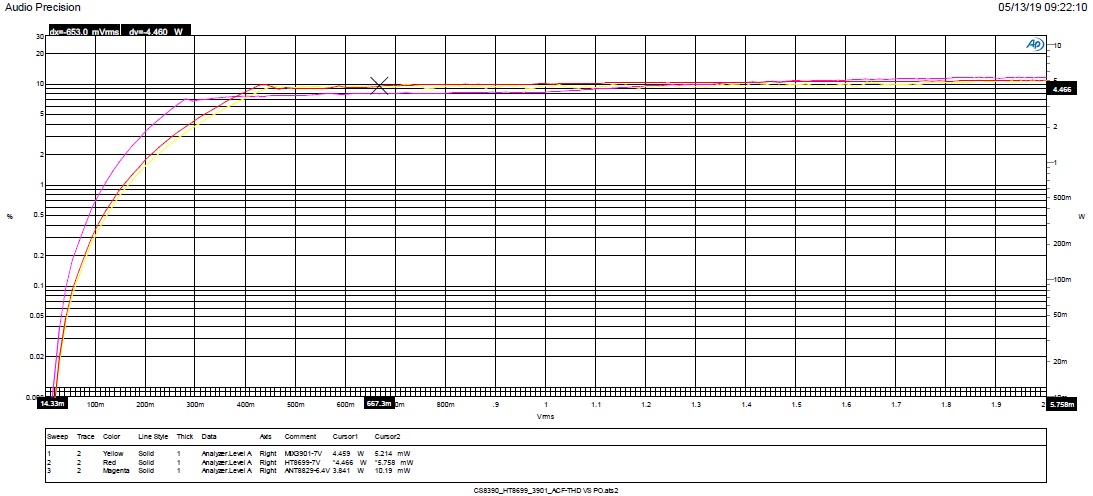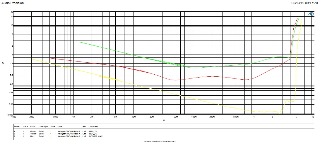 小功率測試,整個音頻范圍,MIX3901失真度最小,0.01%~0.02%之間;ANT8829在中低頻部分比HT8699好;HT8699在中高頻部分比ANT8829好。