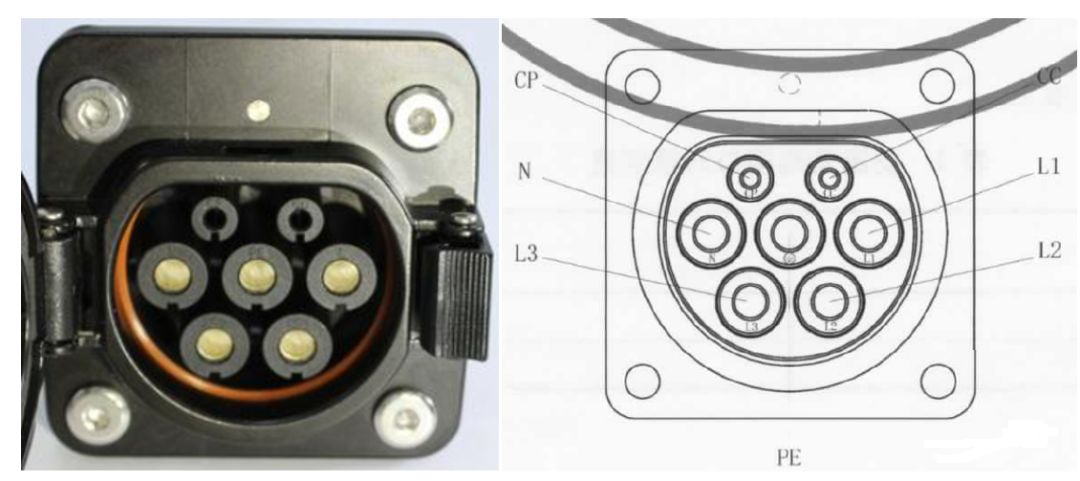 先看一下車輛插座處定義,如下圖所示,它共有7個引腳,其中CC為充電連接確認引腳,CP為充電導引引腳。插頭與插座在互插過程中,PE最先連接,確保有一個穩(wěn)定的地平臺;CCCP最后連接,類似于高壓互鎖確認功能;拔出時,順序則相反。