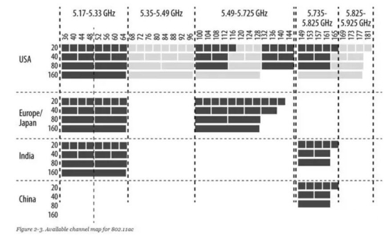 按照IEEE 802.11及其改進標準的規(guī)定,無線局域網(wǎng)所使用的載波頻率分為2.4GHz頻段和5GHz頻段兩部分,每一部分又以一定的頻率間隔來劃分為若干信道。這些信道被稱之為WLAN信道, 每個信道對應(yīng)的頻率實際上是該信道的中心頻率。至于信道的使用分配,則由每個國家自己制定政策。與2.4GHz頻段相比,5GHz頻段的帶寬更大,延遲更低,同時網(wǎng)絡(luò)也更加穩(wěn)定,那么我們直接把2.4GHz頻段去掉不就好了?其實也不盡然,不然現(xiàn)在市面上就不會有那么多的雙頻路由器了。