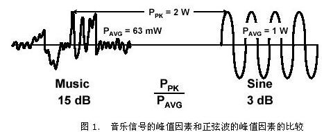 從圖中可以看出,假定音樂(lè)信號(hào)和正弦波的峰值功率都是2瓦,因?yàn)檎也ǖ姆逯倒β屎陀行е倒β手葹?dB,所以正弦波的平均功率為1瓦,而音樂(lè)信號(hào)的峰值因素大約為15dB,所以其平均功率就只有63毫瓦。