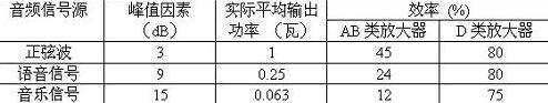 假定其峰值功率為2瓦,那么對(duì)于正弦波的平均功率就是1瓦,而對(duì)于峰值因素為9dB的語(yǔ)音信號(hào),其平均功率就只有0.25瓦,而對(duì)于峰值因素為15dB的音樂(lè)信號(hào)來(lái)說(shuō),其平均功率就只有0.063瓦。它們?cè)谟肁B類(lèi)和D類(lèi)放大器播放的時(shí)候,在效率上的差異就十分巨大。