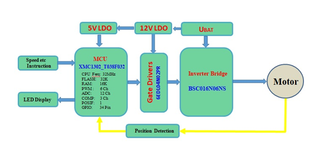 - 基于32位的ARM®Cortex™-M0內(nèi)核微控制器XMC1302-T038F032,內(nèi)置專用電機(jī)控制模塊;