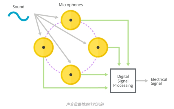 MEMS麥克風(fēng)陣列還可用于確定聲音相對(duì)于陣列的方向。在本應(yīng)用的一種常見(jiàn)實(shí)現(xiàn)中,麥克風(fēng)會(huì)被放置在圓圈或球面的周邊上。采用電子信號(hào)處理識(shí)別各個(gè)麥克風(fēng)發(fā)出的所需信號(hào),同時(shí)可以借助在各個(gè)麥克風(fēng)之間傳送的所需信號(hào)的相對(duì)時(shí)間延遲,確定相對(duì)于麥克風(fēng)陣列的聲音源。