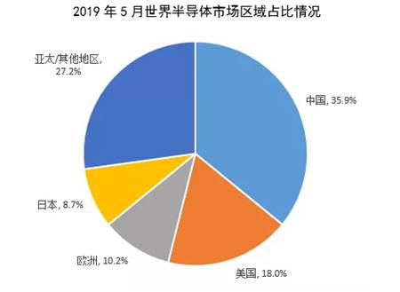 2019年1-5月世界半導(dǎo)體產(chǎn)業(yè)銷(xiāo)售收入為1623.3億美元,同比下降13.6%。其中:中國(guó)市場(chǎng)占35.9%;美國(guó)市場(chǎng)占18.0%;日本市場(chǎng)占8.7%;歐洲市場(chǎng)占10.2%;亞太及其他地區(qū)市場(chǎng)占27.2%。