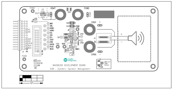 圖6.評估系統(tǒng)MAX98390 EVS PCB設(shè)計圖:頂層元件放置圖(絲印圖)