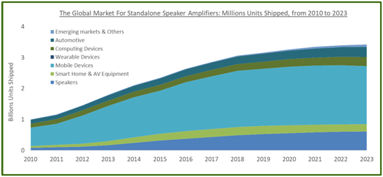 1 資料來(lái)自SAR Insight & Consulting首席研究員Peter Conney于2017年第4季度發(fā)布的音頻功率放大器報(bào)告:市場(chǎng)增長(zhǎng)、通道數(shù)量、放大器類(lèi)型、輸入類(lèi)型、類(lèi)、喇叭保護(hù)。更新數(shù)據(jù)來(lái)自SAR Insight & Consulting于2019年第1季度發(fā)布的音頻信號(hào)鏈IC預(yù)測(cè)DATAbase。