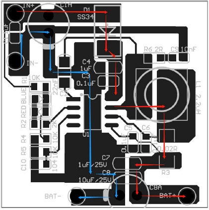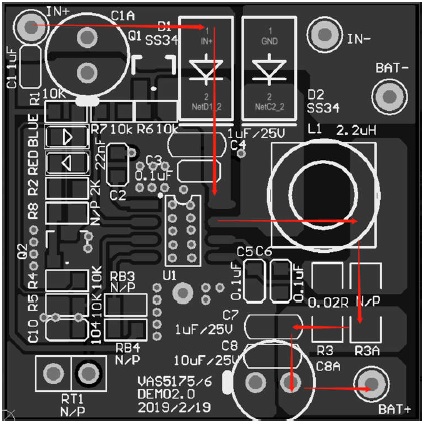 3. 如果充電電流大于1A,為了避免輸入GND走線過細(xì)的問題,C2可以換成插件使用在BS與LX之間,以增加輸入GND的延續(xù)性。