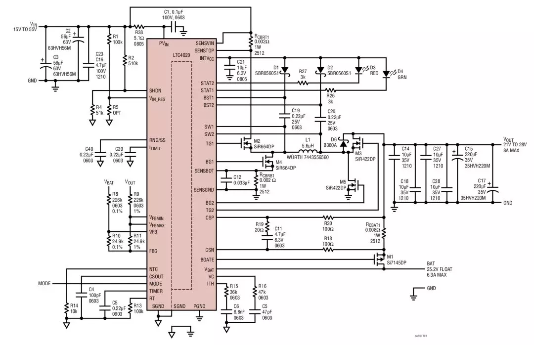圖 1 示出了一個 15V 至 55V 輸入、25.2V/6.3A 降壓-升壓電池充電器,其具有一個高效率四開關 (M2~M5) 同步降壓-升壓型 DC/DC 轉換器,僅需一個電感器 (L1)。專有的平均電流模式架構采用兩個檢測電阻器 (RCBRT1 和 RCBRB1) 來監(jiān)視電感器電流。在該降壓-升壓型解決方案中,當 VIN高于 VOUT時,轉換器在降壓模式工作;當 VIN 低于 VOUT 時,轉換器則工作在升壓模式。當 VIN 接近 VOUT 時,轉換器工作于四開關降壓-升壓模式。