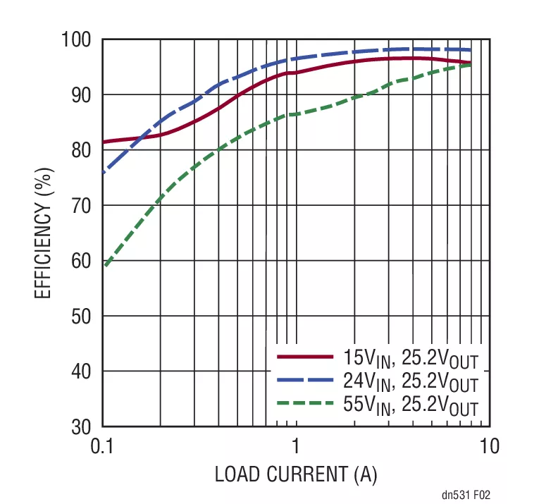 轉換器以一個可編程的恒定開關頻率運作,該頻率處于 50kHz 至 500kHz 的范圍內(nèi),采用一個電阻來設定 (R13 = 100k,250kHz)。圖 1 示出的這款解決方案能夠為系統(tǒng)負載提供高達 8A (VOUT= 25.2V)。如圖 2 所示,滿負載效率 (IOUT = 8A,VIN = 24V) 可達 98% 以上。