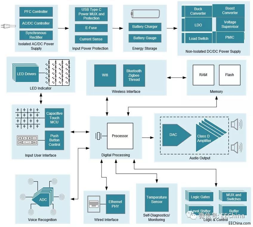 但相比于與互聯(lián)網(wǎng)接口結(jié)合使用的麥克風(fēng)和揚聲器, 這些外形看似簡單的設(shè)備往往更復(fù)雜。智能音箱包含許多電子功能,這些功能均通過采用數(shù)十種復(fù)雜的集成電路(IC) 來實現(xiàn)。原始設(shè)備制造商 (OEM) 憑借差異化產(chǎn)品進入智能揚聲器市場,他們必須決定要提供哪些設(shè)備、如何進行提供以及此類小型低功耗設(shè)備中可采用的折衷方案。