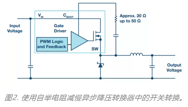 圖1顯示了快速和慢速開關(guān)轉(zhuǎn)換?焖匍_關(guān)轉(zhuǎn)換會(huì)給鄰近電路段產(chǎn)生更強(qiáng)的干擾耦合。存在電壓突變的PCB走線可與具有高阻抗的鄰近走線產(chǎn)生容性耦合。存在電流突變的PCB走線可與鄰近走線產(chǎn)生電感耦合。通過減慢開關(guān)轉(zhuǎn)換,可將這些影響降至最低。圖2顯示了一種經(jīng)驗(yàn)證適用于異步開關(guān)調(diào)節(jié)器的技術(shù)。此處,兩個(gè)開關(guān)中的一個(gè)使用了肖特基二極管。將電阻與自舉電容CBOOT(提供高邊n溝道MOSFET的柵極電壓)串聯(lián),可減慢開關(guān)的開關(guān)轉(zhuǎn)換。當(dāng)無法直接調(diào)整功率MOSFET的柵極信號(hào)線時(shí),此技巧可用于集成開關(guān)調(diào)節(jié)器。如果將開關(guān)控制器與外部MOSFET配合使用,也可將電阻插入柵極驅(qū)動(dòng)走線中。電阻值通常小于100Q。