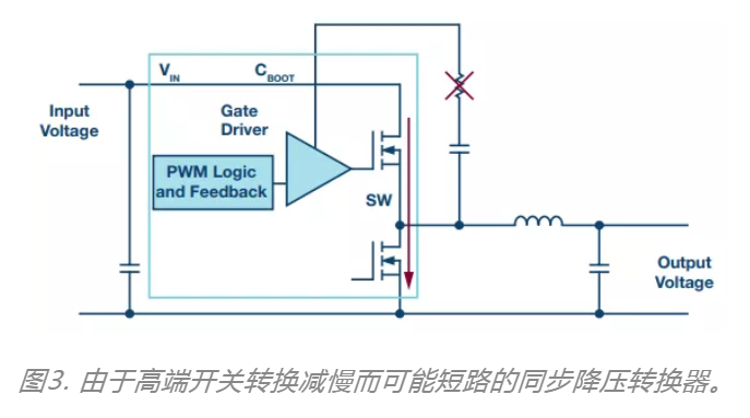 但是,大多數(shù)現(xiàn)代開關(guān)調(diào)節(jié)器都是具有高邊和低邊有源開關(guān)的同步開關(guān)調(diào)節(jié)器。此處,在CBOOT路徑中使用電阻無法明顯減慢開關(guān)轉(zhuǎn)換。如果此處還是使用與CBOOT串聯(lián)的電阻(如圖3所示),則也將減慢高邊開關(guān)的開關(guān)轉(zhuǎn)換。但是,這可能導(dǎo)致低邊開關(guān)沒有完全關(guān)閉。因此,高邊開關(guān)和低邊開關(guān)可能同時(shí)瞬間打開。這將導(dǎo)致輸入電壓到接地之間出現(xiàn)破壞性短路。這一點(diǎn)尤為關(guān)鍵,因?yàn)殚_關(guān)轉(zhuǎn)換速度也受到工作溫度等參數(shù)和半導(dǎo)體制造中的可變性的影響。因此,即使是在實(shí)驗(yàn)室測試,也無法保證安全操作。要減慢具有集成開關(guān)的同步開關(guān)調(diào)節(jié)器的開關(guān)轉(zhuǎn)換,應(yīng)使用可通過內(nèi)部電路直接設(shè)置開關(guān)轉(zhuǎn)換速度的同步開關(guān)調(diào)節(jié)器,例如ADI的ADP5014。在這些集成電路中,可在內(nèi)部確保:在減慢開關(guān)轉(zhuǎn)換時(shí),兩個(gè)開關(guān)不同時(shí)導(dǎo)通,因此也不會(huì)發(fā)生短路,并且在CBOOT路徑中都沒有電阻。