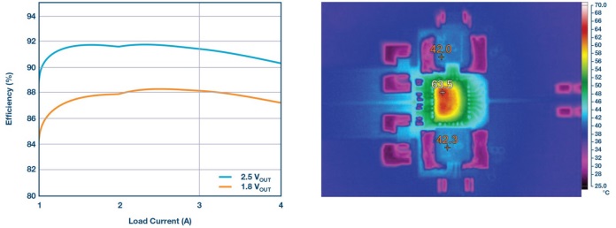 圖1中的雙通道降壓轉(zhuǎn)換器在4 MHz的頻率下運(yùn)行,并使用非常小的電壓和電容。效率和熱性能如圖2所示。熱圖像顯示低于40°C的溫升,在VIN = 5 V室溫下自然對流。