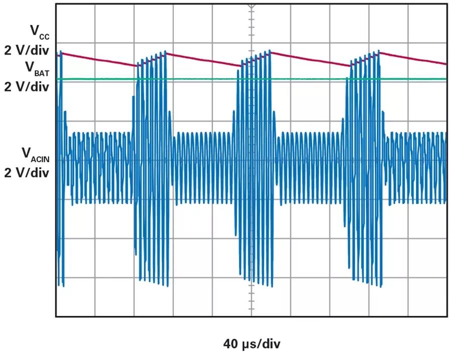 如果LTC4126接收的能量超出所需能量,無(wú)線功率控制器通過(guò)將接收器諧振電路分流接地來(lái)調(diào)節(jié)線性充電器的輸入VCC。這樣,線性充電器將高效運(yùn)行,因?yàn)槠漭斎胝帽3衷陔姵仉妷篤BAT之上。接合分流電路時(shí),諧振電路也會(huì)接收較少的功率,因?yàn)橹C振頻率與發(fā)射器頻率失調(diào)。