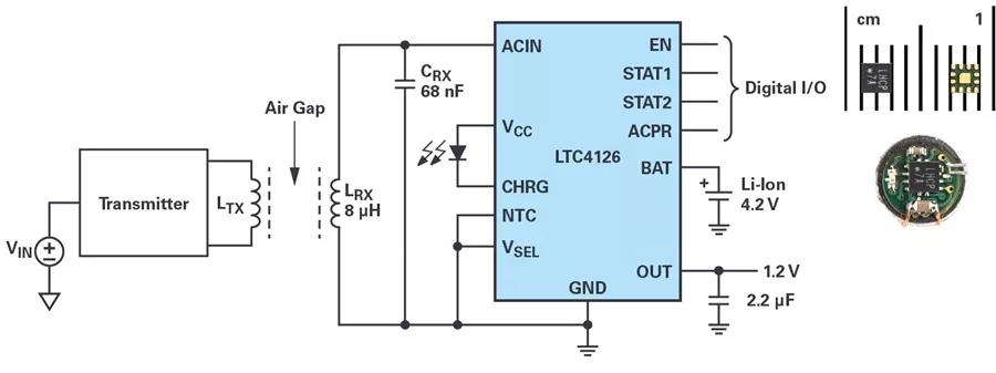 由于LTC4126的高度集成式設(shè)計(jì),只需幾個(gè)外部組件即可創(chuàng)建完整的無(wú)線充電器接收器解決方案。在直徑為6 mm 的應(yīng)用板上,可將整個(gè)設(shè)計(jì)安裝在助聽(tīng)器或耳塞的內(nèi)部。