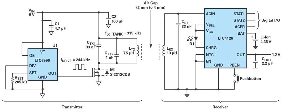 LTC4126是受到良好保護(hù)、高度集成、極其緊湊的無(wú)線充電器接收器解決方案,是可穿戴設(shè)備的理想選擇。將LTC4126(可穿戴設(shè)備端)與基于LTC6990(充電站端)的ZVS單晶體管發(fā)射器組合在一起,可輕松實(shí)現(xiàn)完整的無(wú)線充電解決方案,基于這些設(shè)備的完整解決方案具有低功耗和低成本。