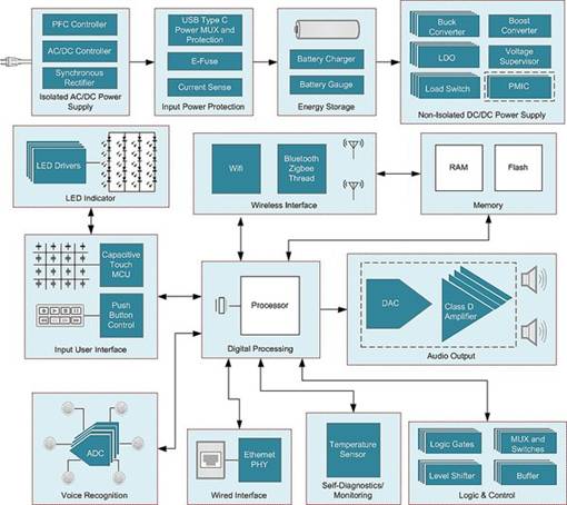 由于這些音箱通常放置在床頭柜或書(shū)桌上,交流電源可輕松獲得,因此電池電源并非是必不可少的。但是,考慮到這些音箱的位置,增加電池充電功能則具有重要意義,可以通過(guò)USB或無(wú)線方式為智能手機(jī)和智能手表充電。最后,消費(fèi)者需要可以在這些位置連接并控制燈光、恒溫器和安防系統(tǒng)。