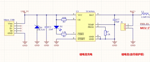 這款TC4056A也是市面上比較常見的一款單節(jié)鋰電池充電管理芯片,充電電壓固定在4.2V,最大充電電流可大1A,同時自帶鋰電池溫度檢測、欠壓閉鎖、自動再充電和兩個用于指示充電、結(jié)束的LED狀態(tài)引腳。眼尖的高手們或許發(fā)現(xiàn)了筆者電路上的一個問題,那就是,鋰電池充電部分并沒有帶保護電路,是不是有安全隱患?其實不然,因為筆者使用的電池是鋁包電池,而非18650那種鋰電池,這種鋁包電池本身就已經(jīng)帶了保護板,所以筆者也就沒有再多此一舉了,那樣也浪費物料。