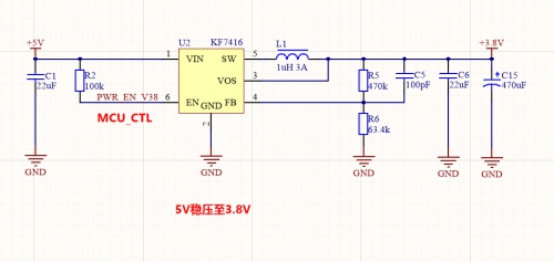 接下來,就是3.8V的穩(wěn)壓芯片,筆者這里選用的也是一款可以電壓輸出的芯片KF7416,這款芯片的轉(zhuǎn)換效率也是最高可達到95%,外圍電路也是非常的簡單,SOT23-6的封裝,也算是很節(jié)省空間了。